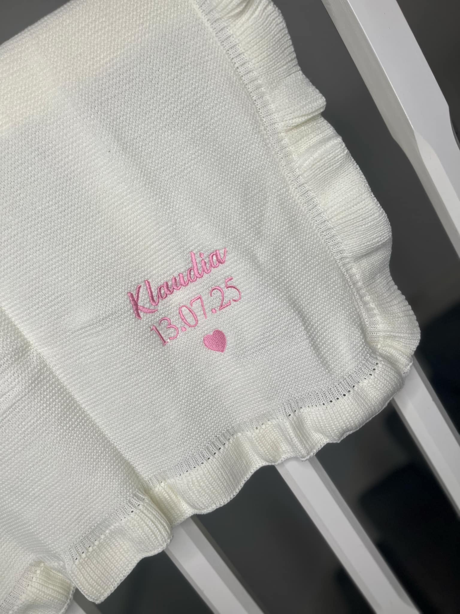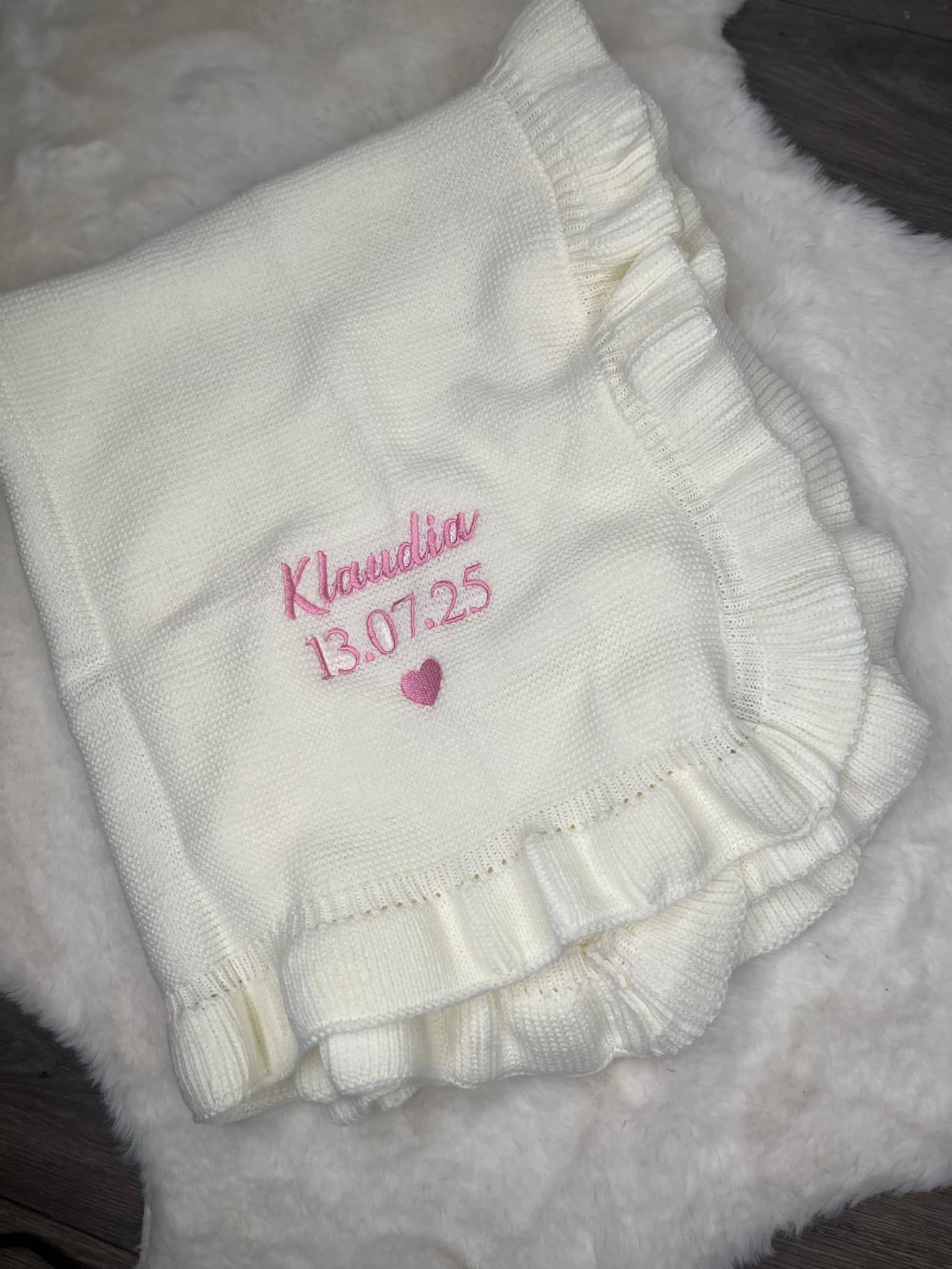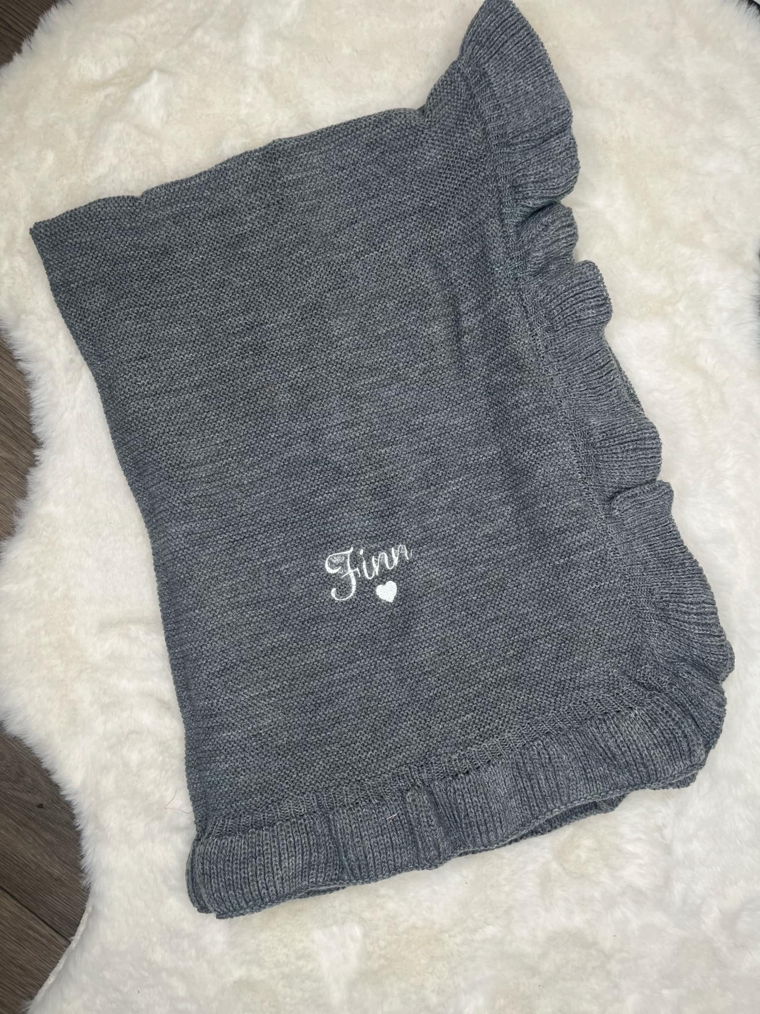 Personalised Frilled Knitted Baby Blanket Available in white, pink, grey and blue. It can be personalised with baby name, family name, weight ,dob. it make a lovely baby shower, gender reveal or gift for a family or friend who's just had a baby. A range of coloured thread to choose from. This blanket is perfect for keeping your newborn cosy at home, on walks, or during nap time and is a lovely keepsake.
