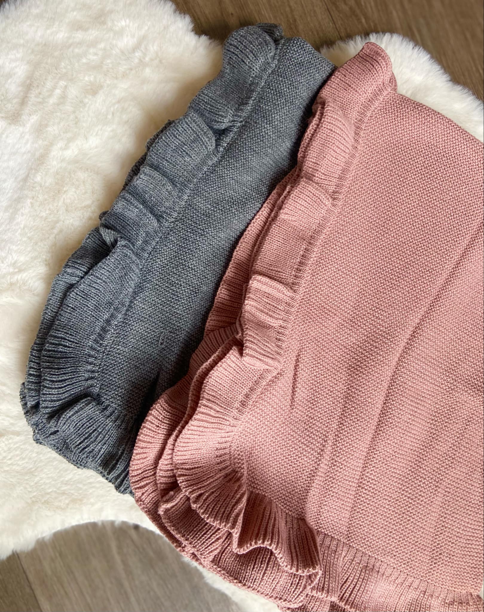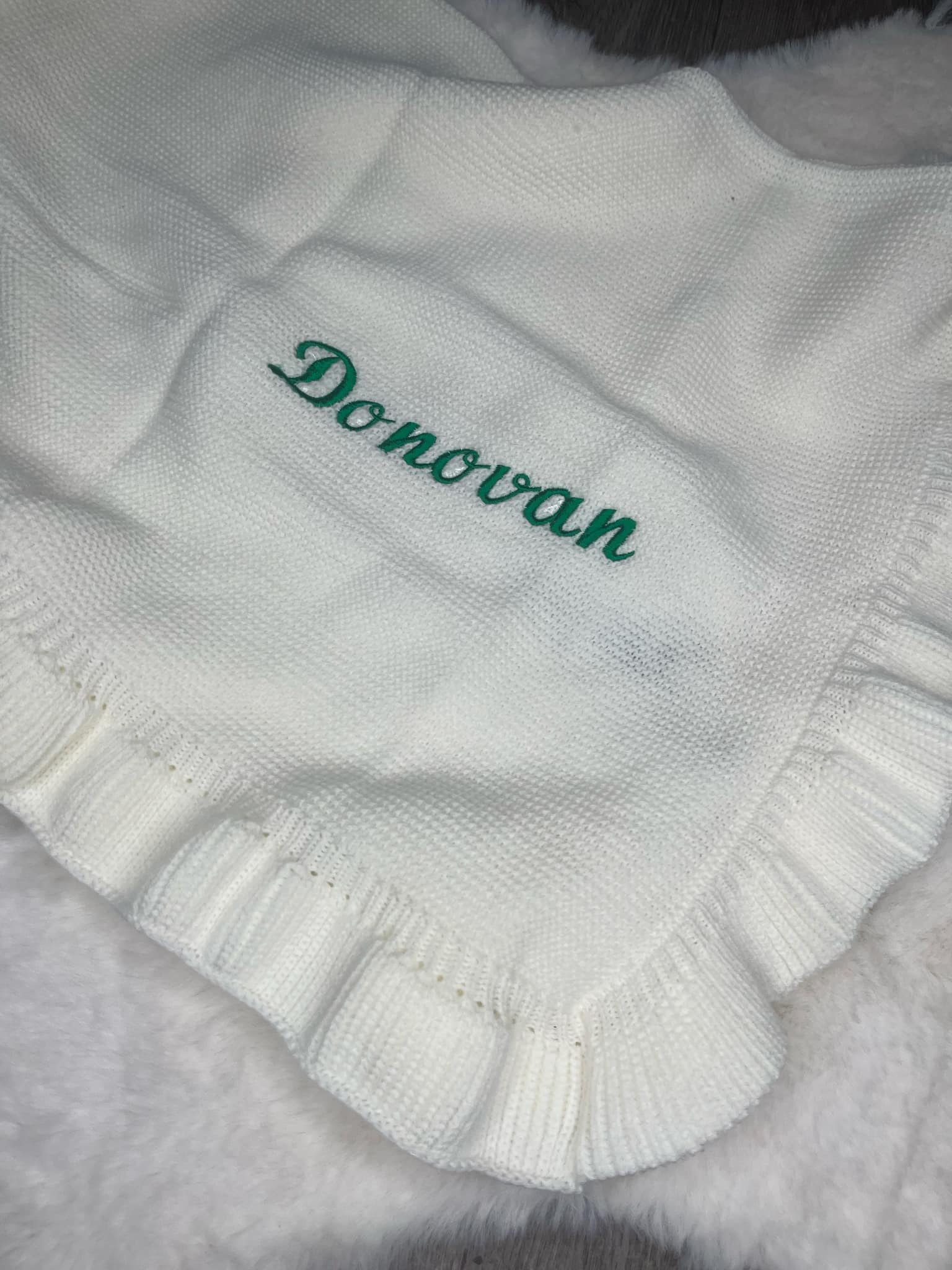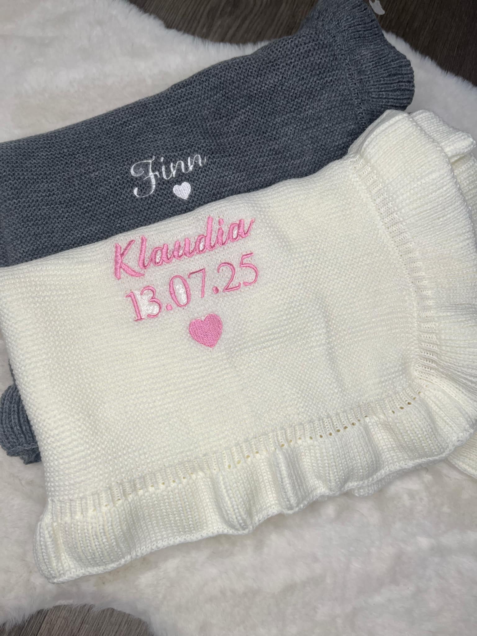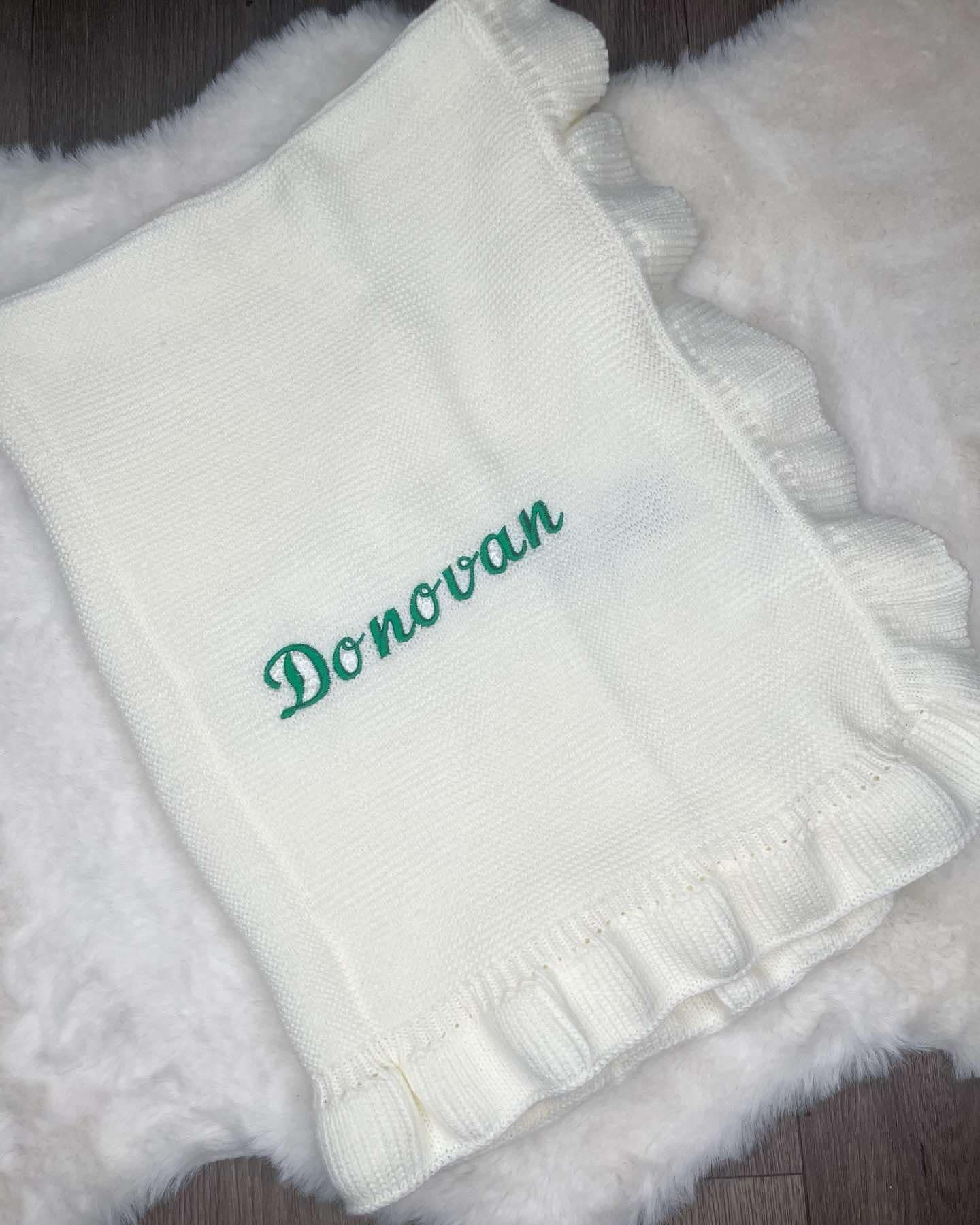 Personalised Frilled Knitted Baby Blanket Available in white, pink, grey and blue. It can be personalised with baby name, family name, weight ,dob. it make a lovely baby shower, gender reveal or gift for a family or friend who's just had a baby. A range of coloured thread to choose from. This blanket is perfect for keeping your newborn cosy at home, on walks, or during nap time and is a lovely keepsake.