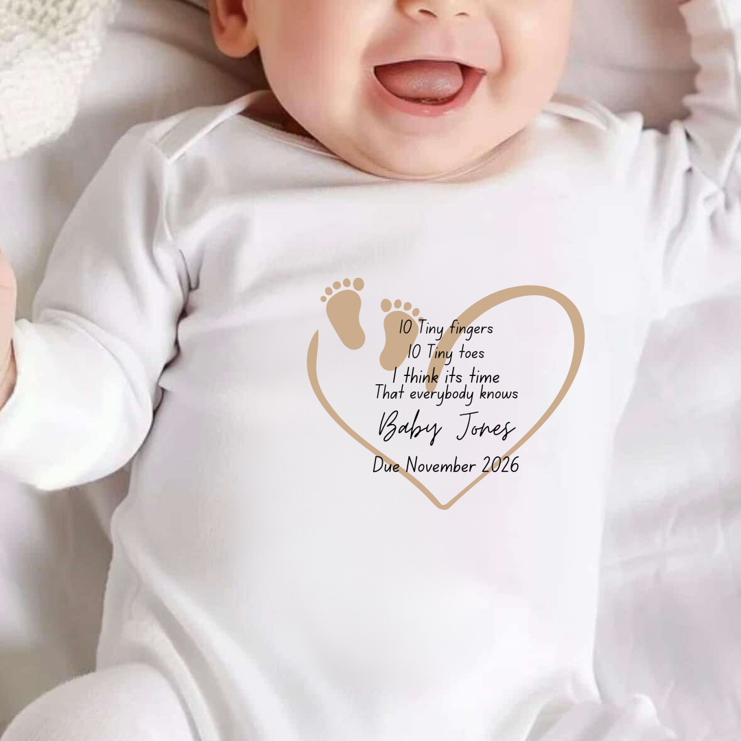 The perfect announcement vest for women or couples expecting our customisable Baby Announcement Vest— designed especially for soon-to-be mum and dad! sizes newborn through 12 months can be used as a prop for your announcement and then when the little one arrives it makes a lovely photo too! Personalise with your family name and due date. Perfect for maternity photo shoots, gender-neutral pregnancy reveals, Baby announcement photos for social media. A heartfelt keepsake that captures this special moment you’ll treasure forever.