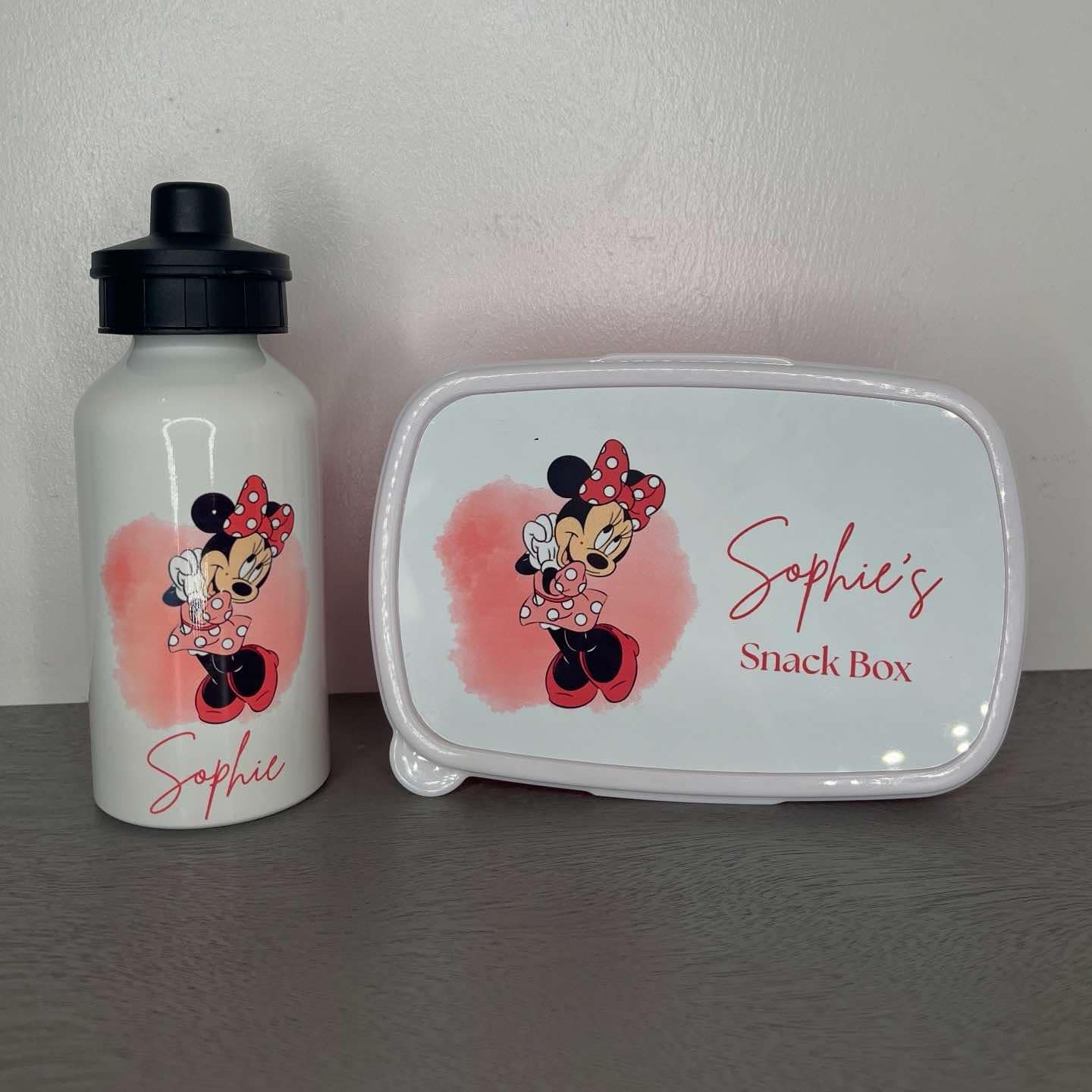 This lovely little set can be personalised with your child's favourite character, shows, movie stars and more. just let us know what you'd like and we will create a design and send you a preview before we print. Snack box is also available in a blue colour. Water bottle is made from aluminium and holds 500ml.