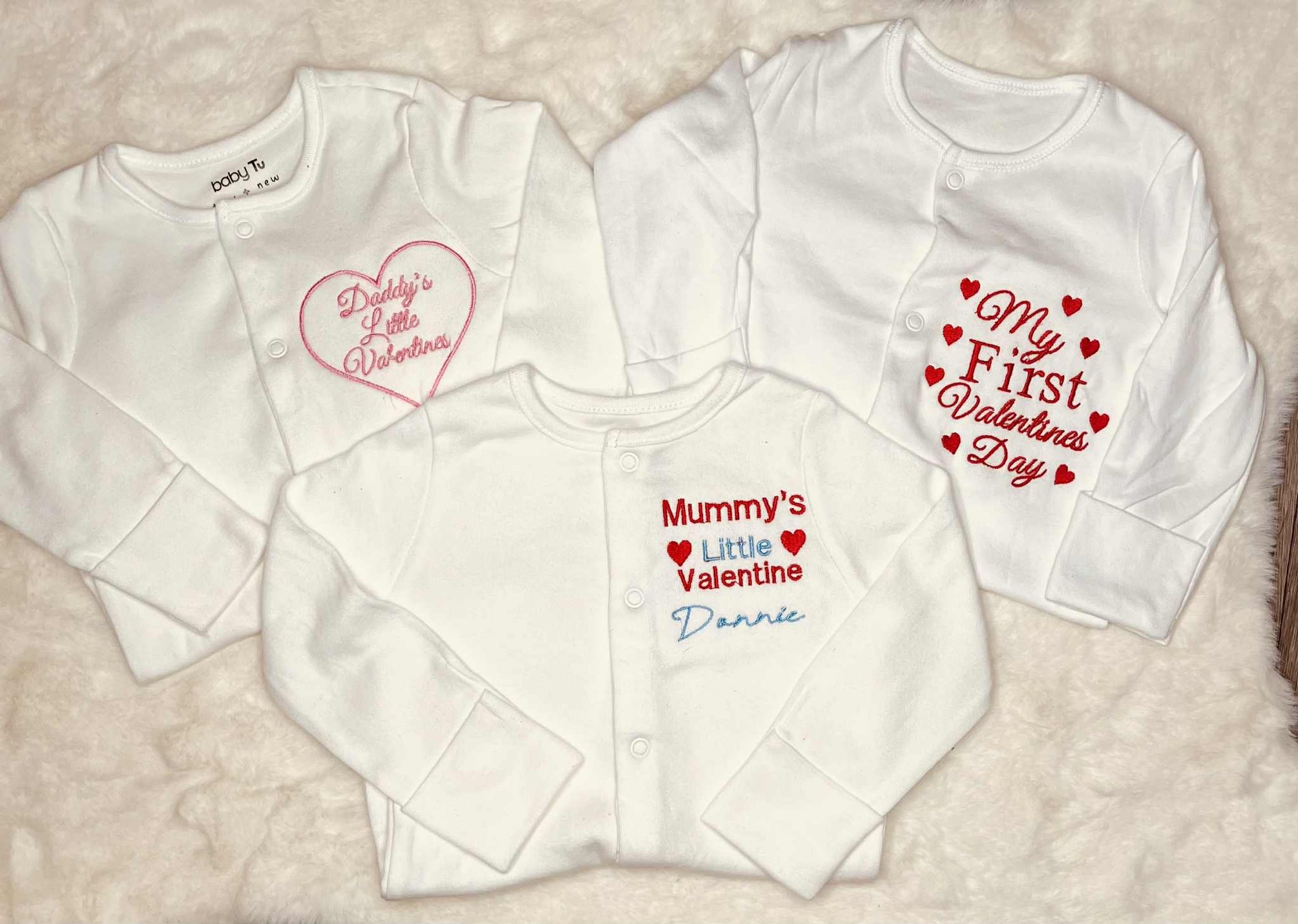 Made from super soft cotton this baby sleepsuit is perfect for celebrating your little ones first valentines day and valentines day photoshoots . Available in sizes newborn to 24 months . Can be personalised with your child name. Daddy can be changed to mummy,grandma,nana etc. . Text can be done in: Red,Pink,Blue,Lilac ,black-If you don't state a text colour it will be done red.