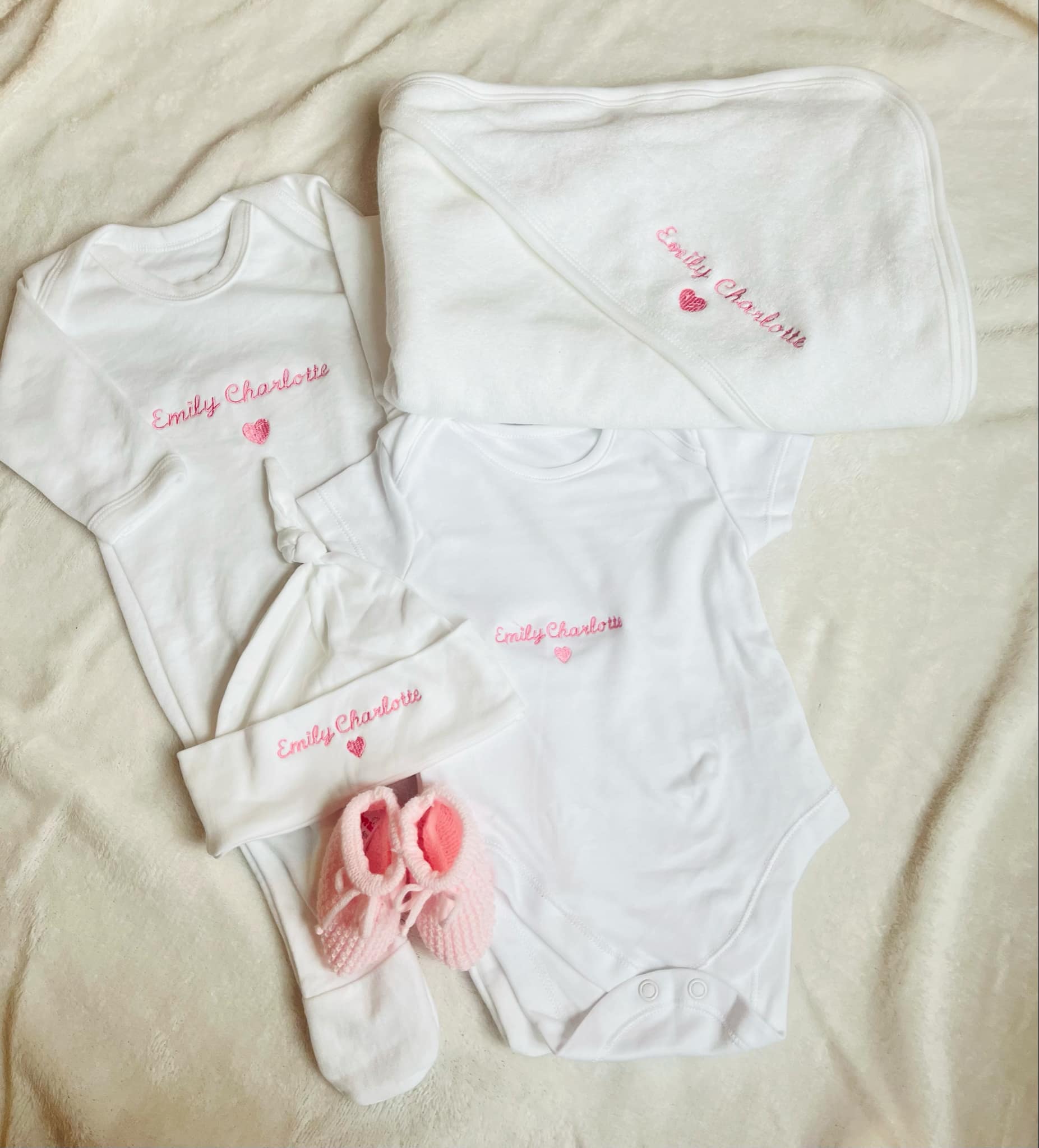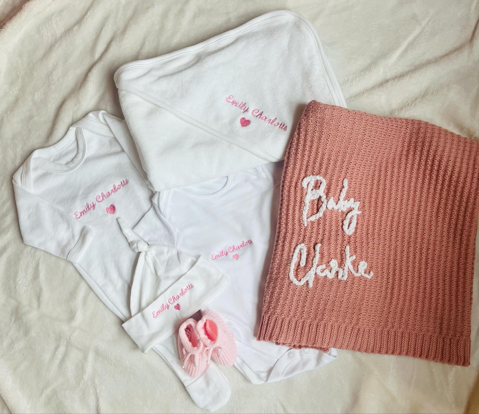 This beautiful embroidery baby set is the perfect gift whether you’re expecting a little miss or mister. Each piece is lovingly embroidered and can be personalised with your baby’s name, initials, surname, or even a sweet little quote. Available in a range of thread colours to suit your style.