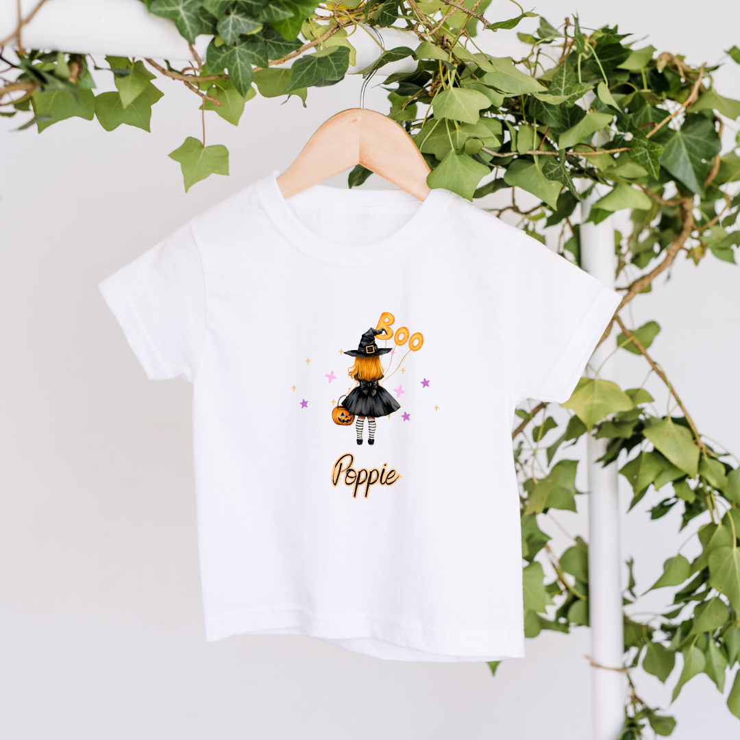 The perfect little Halloween t-shirt for your little one weather its pumpkin picking ,trick or treating or just everyday. The t-shirt comes in sizes 1-2 years to 10 years and can be personalised with your child's name, year is optional. The witches hair colour can be customised to match your child's