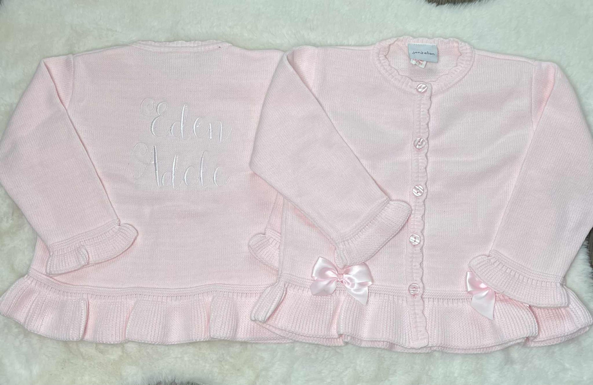 A lovely new girls frilly bow cardigan from Dandelion clothing. A pink knitted cardigan, ideal to wear over dresses and clothing. personalised with text of your choice in the colour of your choice!